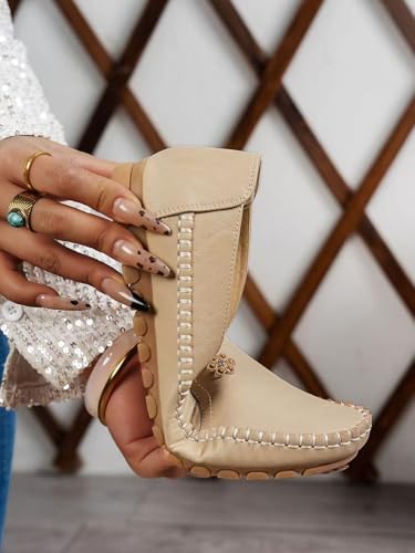 Women's Orthopedic Leather Loafers, Beige Slip-On Flats, Casual Comfort Walking Shoes with Barefoot Feel, Anti-Slip Rubber Sole, PU Upper