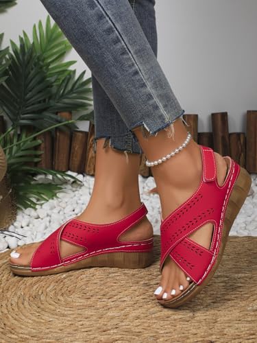 Women's Perforated Leather Sandals | Leaf Cut-Out Design & Adjustable Velcro Strap | Cushioned Wedge Heel Summer Casual Sandals Shoes